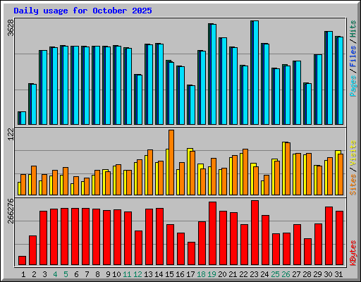| Day | Hits | Files | Pages | Visits | Sites | KBytes | ||||||